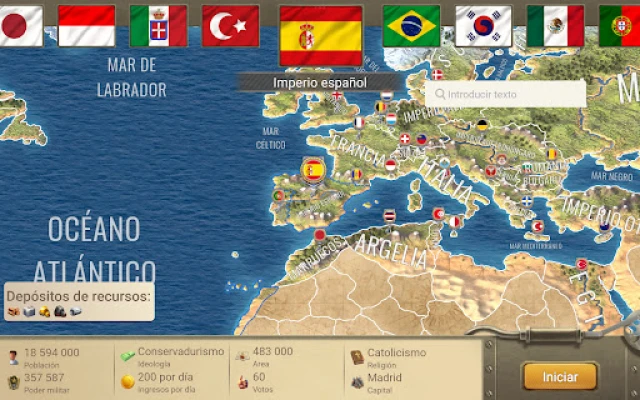 Sumérgete en un juego de estrategia global donde liderarás una de 70+ naciones hacia la dominación mundial. Gestiona tu economía y recursos vitales, forja un ejército imponente y navega por complejos conflictos. Emplea la diplomacia, pactos y comercio para asegurar tu posición frente a guerras y separatismo.