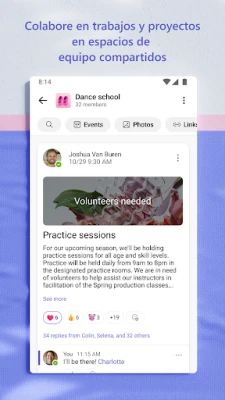 **Teams** es tu aliado estratégico para hacer realidad planes y proyectos. Comparte momentos importantes con fotos y vídeos directamente en los chats, y accede a documentos y archivos clave desde cualquier lugar gracias al almacenamiento en la nube. Las comunidades pueden organizar su contenido compartido –eventos, fotos, enlaces– para una referencia instantánea, eliminando la búsqueda de información. Eleva tus reuniones con funcionalidades avanzadas como compartir pantalla, pizarras interactivas y salas de grupo virtuales, y mantén el control sobre quién accede a la información, asegurando una colaboración eficiente en todo momento. Las listas de tareas integradas te permiten asignar responsabilidades, establecer fechas límite y seguir el progreso para mantener a todos alineados.