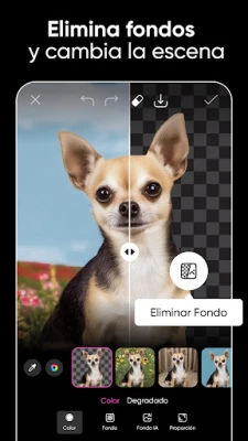 Transforma tus ideas en obras maestras visuales con Picsart, la plataforma definitiva para la edición creativa. Domina tus fotografías con una suite de herramientas profesionales: aplica filtros de tendencia y efectos innovadores, elimina o sustituye fondos con precisión usando el Borrador de Fondos, o refina tus imágenes eliminando elementos no deseados con Remover Objeto. Accede a millones de imágenes gratuitas o personaliza las tuyas, añade texto con una impresionante colección de más de 200 fuentes y perfecciona tus selfies con retoques, cambio de color de cabello y stickers de maquillaje. La selección inteligente con IA te permite desenfocar fondos, mientras que las opciones de recorte y volteo aseguran una composición perfecta. ¡Incluso puedes crear tus propios stickers personalizados para darle un toque único a cada edición!